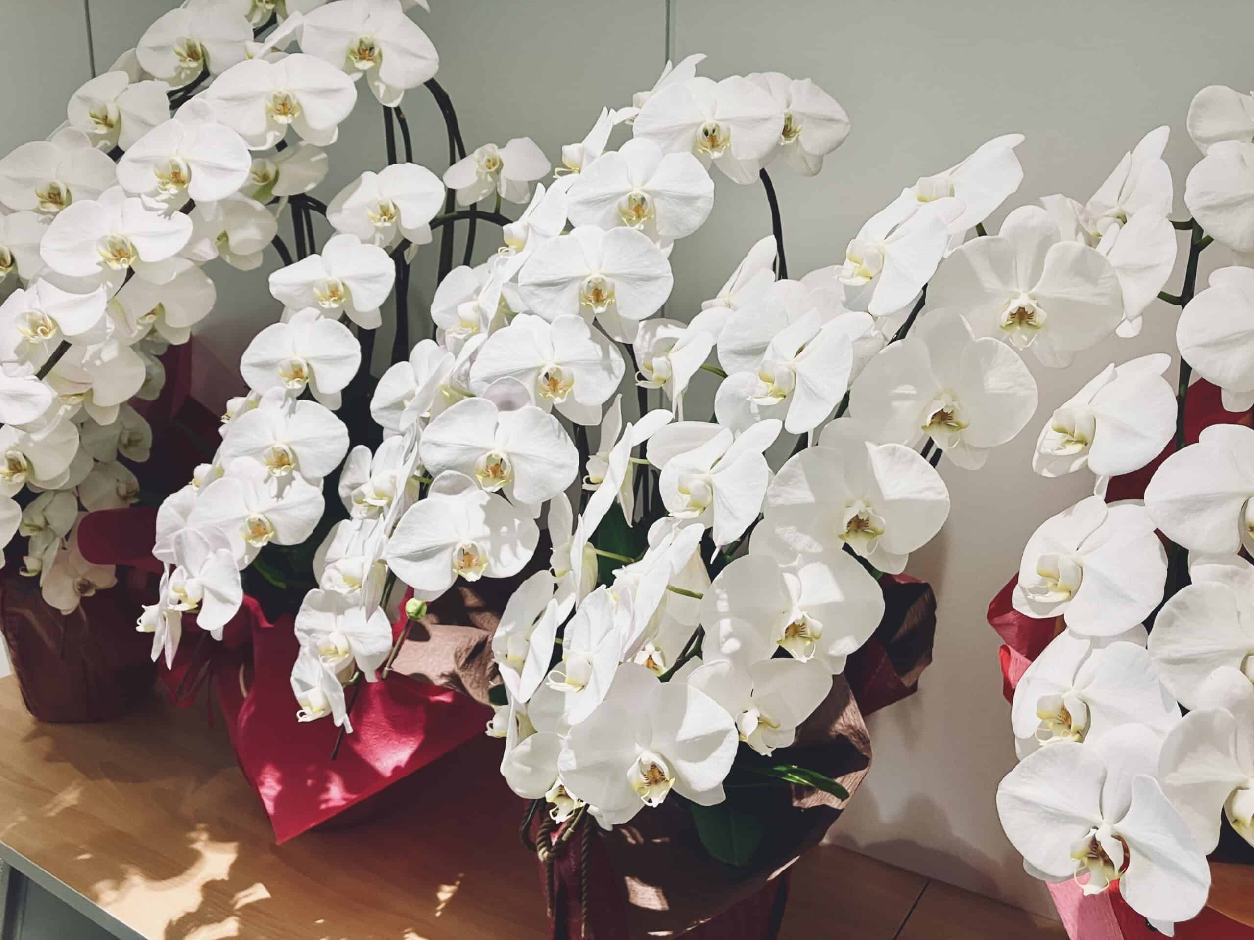 一方で胡蝶蘭は、上品さや格式を重視したいときに適しています。香りや花粉が少なく、室内に飾りやすいため、受付まわりやオフィス、就任祝い、移転祝い、周年祝いなど法人用途でもよく用いられます。
