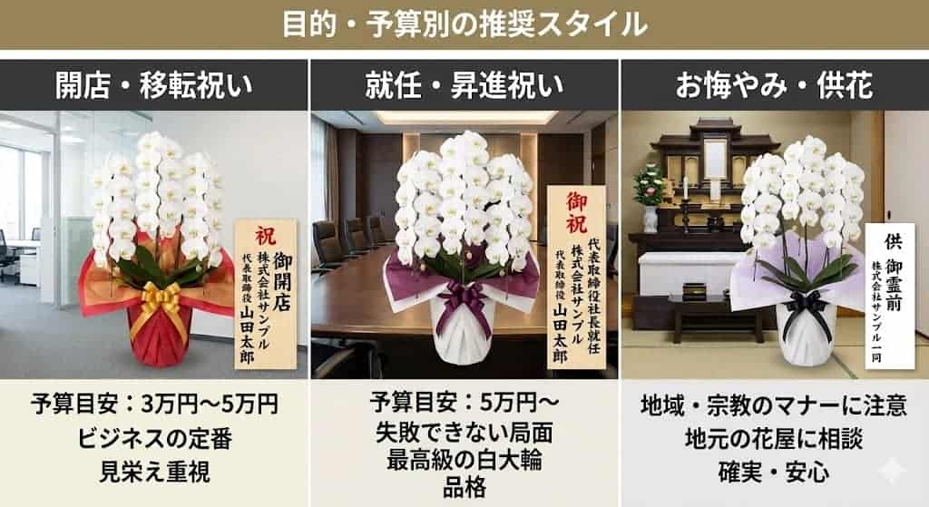 飲食店、美容室、サロン、クリニック、物販店など、業種によって似合う雰囲気は少しずつ異なります。贈る相手のお店のテイストや立地、来店されるお客様の層を意識して選ぶことで、見栄えだけでなく気遣いの伝わる一基になります。